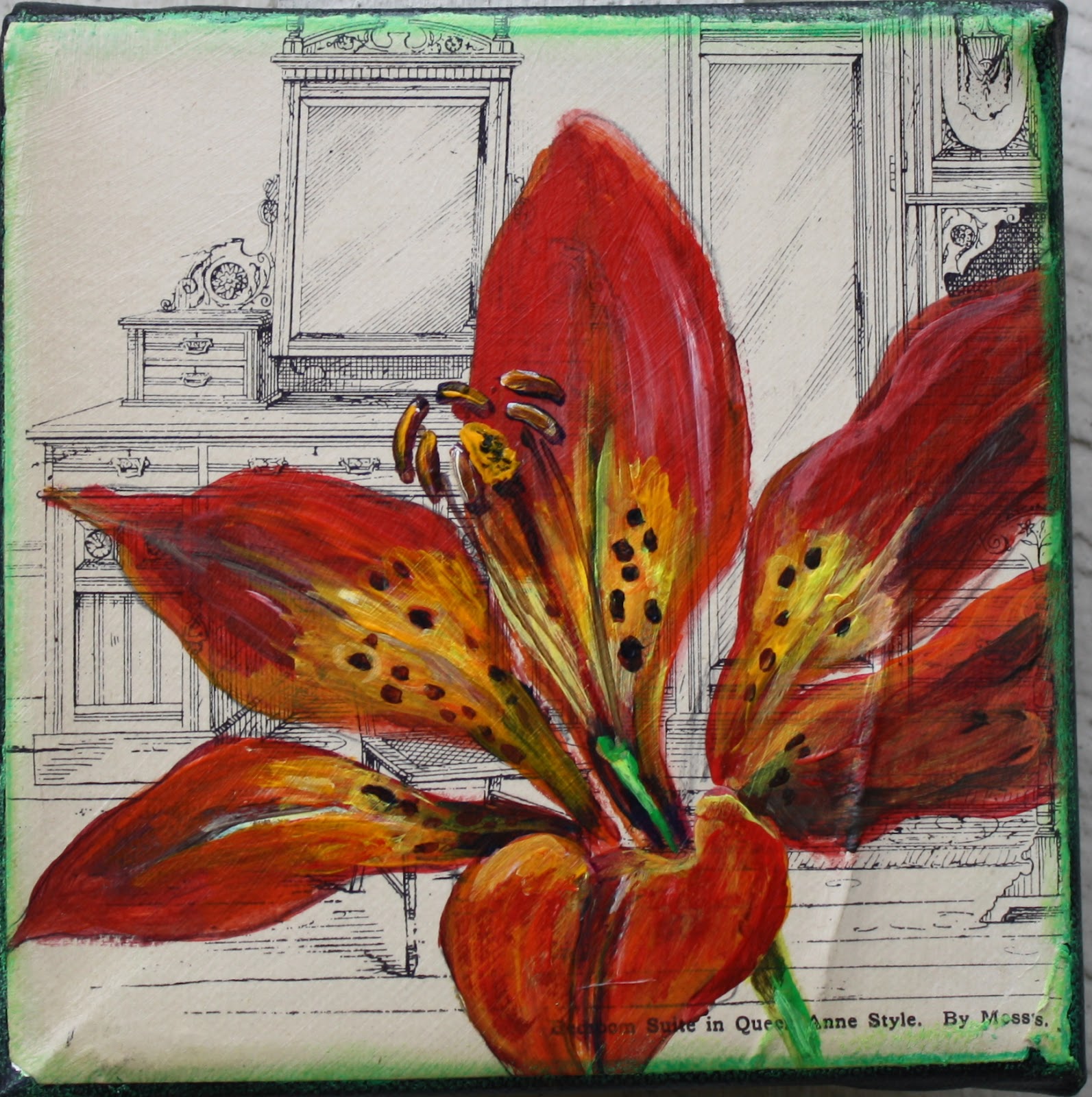 I just adore the lovely background papers on these delicate floral paintings. These are pages taken from a late 19th Century Furniture Design Book. I like to give viewers something to explore after the initial painting itself. Using old pages from antique books, handwritten letters and journal pages and vintage invoices adds a second layer of interest. Originally painted as 6"x6".